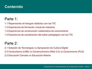 El documento discute las perspectivas contemporáneas de la educación virtual, abordando temas como la relación entre la tecnología y la cultura digital, los diferentes enfoques pedagógicos (conductismo, constructivismo y conectivismo) y la comparación entre educación cerrada y abierta. Se argumenta que la simple dotación de tecnologías no es suficiente y que se necesita una apropiación cultural efectiva. Además, se resalta la importancia de la participación activa en el proceso de aprendizaje frente a enfoques pasivos.