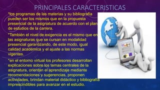 La educación virtual permite que los estudiantes accedan a contenidos educativos de forma flexible a través de internet desde cualquier lugar y hora. Los estudiantes pueden administrar libremente su tiempo de estudio y trabajar con los materiales a su propio ritmo a través de una plataforma virtual. El nivel de exigencia y calidad académica es el mismo que en la educación presencial. Los profesores orientan el aprendizaje mediante recomendaciones y sugerencias a través de la plataforma virtual.