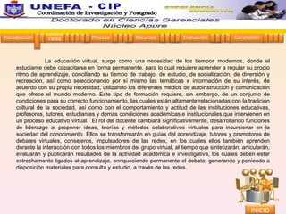 El documento aborda la educación virtual como una necesidad contemporánea que requiere un cambio significativo en el rol del docente y en las habilidades del estudiante. También se resalta la importancia de la gestión del conocimiento y las redes de conocimiento en la educación, así como la interrelación entre tecnología, innovación y aprendizaje. Además, se discuten las condiciones y metodologías requeridas para un proceso educativo virtual efectivo en un contexto globalizado.