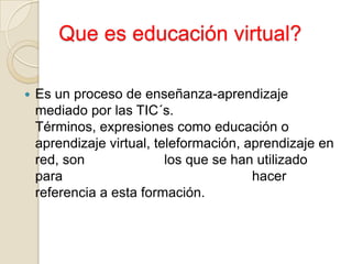 El documento describe la educación virtual, que es un proceso de enseñanza-aprendizaje mediado por las tecnologías de la información y la comunicación. Se utiliza para desarrollar metodologías alternativas de aprendizaje para estudiantes limitados por su ubicación geográfica. La educación virtual es oportuna, motivadora y compatible con la educación presencial. Se compone de distribución de información, intercambio de ideas, aplicación de conocimientos y evaluación a través de sistemas seguros y confiables. Existen mé