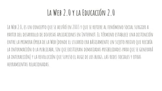 La Web 2.0 permite una mayor interacción entre usuarios a través de plataformas como blogs, redes sociales y wikis. Estas herramientas permiten que los usuarios publiquen y compartan contenido en lugar de solo recibir información. La Web 2.0 transformó a los usuarios de meros receptores pasivos a creadores activos de contenido que pueden interactuar e influir mutuamente.