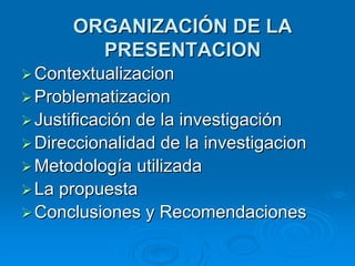 Este documento presenta una investigación sobre la educación a distancia en universidades venezolanas. Se discute el contexto y la necesidad de la investigación, así como los problemas actuales como la falta de sistematización de experiencias y bases teóricas frágiles. La investigación busca generar líneas de investigación y proyectos desde la perspectiva de los investigadores universitarios, examinando conceptos clave de la educación a distancia e investigación. Se presentan los resultados de un diagnóstico y una propuesta de línea de investigación denominada "Educación a