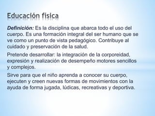 La educación física abarca el desarrollo integral del cuerpo humano desde un enfoque pedagógico, contribuyendo a la salud y permitiendo que los niños conozcan y expresen su motricidad a través de deportes como básquet, handball y fútbol de manera lúdica. El uso de blogs en la materia mantiene la información actualizada y brinda apoyo a los alumnos. Se trabajará el cuerpo y la higiene personal para generar habilidades motrices y prevenir enfermedades.