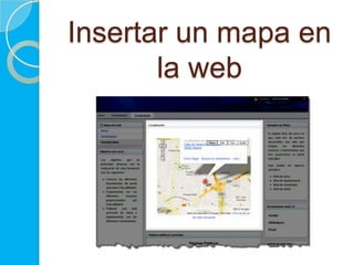 Para insertar un mapa en una página web, primero se obtiene el código de embebido del mapa deseado de Google Maps. Luego, se crea un nuevo contenido en el portal web y se pega el código de embebido dentro del cuerpo del contenido. Finalmente, se hace visible el contenido con el mapa embebido en la página web deseada añadiéndolo como un recurso.