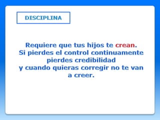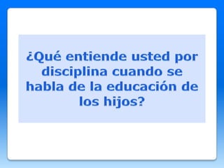 Este documento discute estrategias para transmitir valores a los hijos y alumnos de una manera que los ayude a crecer como personas. Sugiere utilizar menos explicaciones y emociones exageradas, y enfatiza la importancia del autocontrol para poder disciplinar de forma efectiva sin recurrir a la violencia o los golpes. Además, propone enfocarse en controlar la propia reacción ante malos comportamientos en lugar de preguntarse qué hacer con el niño.