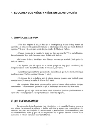 El documento aborda la importancia de educar a los niños y adolescentes en autonomía y responsabilidad, destacando que iniciar este proceso desde temprana edad es fundamental para su desarrollo. Se enfatiza el papel de los padres como educadores y la necesidad de establecer un equilibrio entre intervención y libertad para fomentar la toma de decisiones y la autoestima en los hijos. Además, se sugiere que la comunicación abierta y el respeto mutuo entre padres e hijos son clave para el desarrollo de una autonomía bien entendida.
