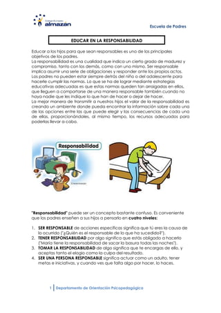 Educar a los hijos para que sean responsables es un objetivo clave de los padres. La responsabilidad implica asumir obligaciones y responder por las propias acciones. Los padres deben enseñar normas y dar responsabilidades acordes a la edad del niño para fomentar su madurez y compromiso. El mejor método es el ejemplo de los padres y dar independencia de forma gradual a medida que el niño crece.