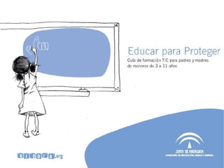 Este documento presenta un plan para educar a padres e hijos sobre el uso responsable y seguro de la tecnología. Explica que los padres deben involucrarse para evitar convertirse en "huérfanos digitales" y enseñar valores a sus hijos. También ofrece consejos sobre el uso apropiado de dispositivos como teléfonos, videojuegos y ordenadores, así como sobre establecer normas de tiempo de pantalla y contenido. El objetivo final es que las familias usen la tecnología de forma positiva para compartir y apo