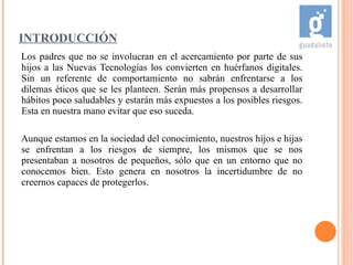 El documento presenta una introducción sobre la importancia de que los padres se involucren en el uso que hacen sus hijos de las nuevas tecnologías para evitar que se conviertan en "huérfanos digitales". Explica que existen dos enfoques posibles: la disciplina y censura o la educación en valores, siendo esta última la opción recomendada. También resalta que el mayor riesgo es no usar las tecnologías y la necesidad de que los padres conozcan estas herramientas para aconsejar adecuadamente a sus