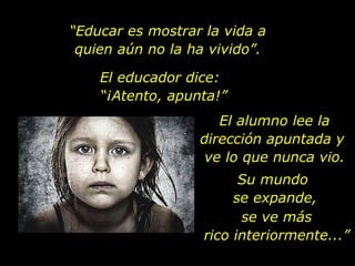 Este documento trata sobre la importancia de la educación y la enseñanza. Resalta que la educación consiste en mostrarle al estudiante el mundo que aún no ha vivido y expandir su perspectiva. También enfatiza la importancia de educar las sensibilidades de los estudiantes para que puedan apreciar la belleza del mundo y encontrar razones para vivir. El autor cree que los niños aún tienen la capacidad de asombrarse con lo simple y que la escuela debería enfocarse más en ayudar a los estudiantes a comprender el mundo que en memorizar