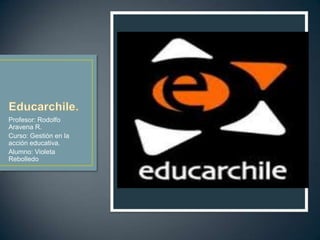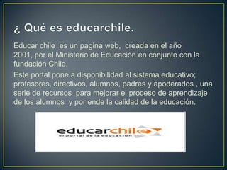 Educarchile es un portal web creado en 2001 por el Ministerio de Educación y la fundación Chile para proveer recursos educativos gratuitos que apoyen el aprendizaje de estudiantes y mejoren la calidad de la educación. El sitio ofrece materiales didácticos como presentaciones y videos, así como estrategias de enseñanza para apoyar a profesores. También mantiene a la comunidad educativa actualizada con noticias diarias e información relacionada al currículo.