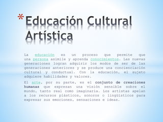 La educación es un proceso fundamental para la adquisición de conocimientos y valores, mientras que el arte refleja la visión humana del mundo. La educación artística permite canalizar emociones a través de la expresión creativa y contribuye al desarrollo cultural. Organismos como la UNESCO y el gobierno de España promueven iniciativas para fortalecer la educación artística, que debe adaptarse a los cambios de la noción de arte a lo largo del tiempo.