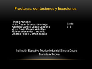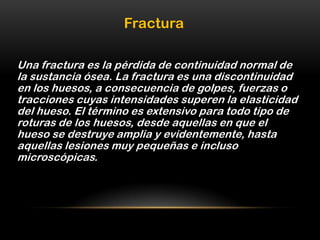 Este documento describe diferentes tipos de lesiones óseas y articulares, incluyendo fracturas, luxaciones y contusiones. Explica que una fractura es la ruptura parcial o total de un hueso, mientras que una luxación es la separación permanente de las dos partes de una articulación. Una contusión es una lesión no penetrante causada por un objeto duro que puede causar daño desde equimosis hasta lesiones internas graves. El documento también cubre la clasificación, síntomas y tratamiento básico de estas lesiones.