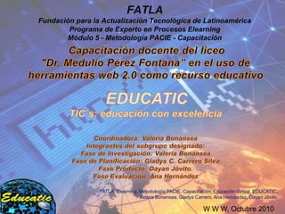 El documento describe un proyecto de capacitación para docentes del liceo público 'Dr. Medulio Pérez Fontana' en Nueva Palmira, Uruguay, centrado en la metodología PACIE y el uso de herramientas web 2.0 para optimizar el aprendizaje en el ciclo básico y bachillerato. Se establecen objetivos específicos para mejorar el uso de TIC en el aula, fomentar el aprendizaje colaborativo y mantener la motivación docente. El proyecto incluye una estructura detallada de módulos de capacitación y costos asociados, con un enfoque en la evaluación de su efectividad a través de la tutoría entre docentes.