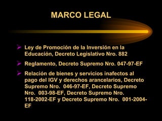 Este documento describe el marco legal de las instituciones educativas privadas en Perú y los beneficios tributarios que reciben. Las instituciones educativas privadas están exentas del pago de impuestos directos e indirectos sobre bienes y servicios relacionados con su función educativa. También tienen derecho a un crédito tributario del 30% por reinvertir sus utilidades en infraestructura educativa o becas. Deben cumplir con obligaciones formales como emitir comprobantes de pago y llevar libros contables establecidos por ley.