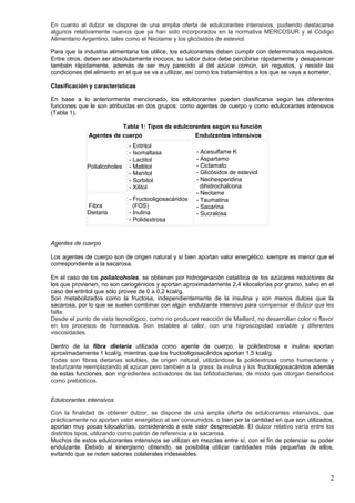 Este documento presenta una revisión de los edulcorantes, incluyendo su historia, clasificación, funciones, marco regulatorio y seguridad. Explica que los edulcorantes pueden clasificarse como agentes de cuerpo o edulcorantes intensivos. Detalla varios edulcorantes comunes como la sacarina, el ciclamato y la sucralosa, y discute estudios que indican que el consumo moderado de edulcorantes artificiales probablemente no es perjudicial para la salud. Concluye que los edulcorantes pueden ayudar a