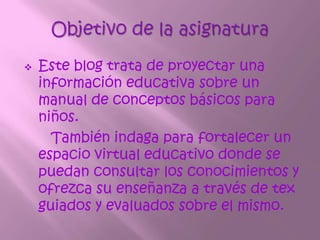 Este documento describe un blog educativo sobre conceptos básicos de computación para niños. Explica los componentes de una computadora como el monitor, teclado y ratón. También cubre temas como cómo usar el teclado y la importancia de las computadoras. Además, habla sobre los sistemas operativos, incluyendo Windows, y cómo abrir Microsoft Word. Resalta que los sistemas operativos gestionan los recursos del hardware para facilitar el uso de las computadoras.