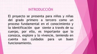 Este documento presenta un proyecto educativo para niños de primero a tercer grado sobre el reconocimiento y cuidado del cuerpo. El proyecto busca que los niños reconozcan, exploren y aprendan a cuidar su cuerpo a través de actividades sobre las partes del cuerpo, los sentidos, hábitos de higiene y alimentación saludable. El proyecto se desarrollará en grupos y utilizará videos, lecturas e internet como recursos educativos.