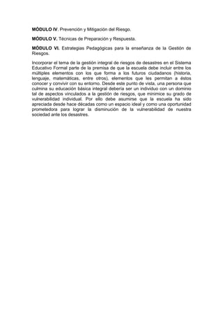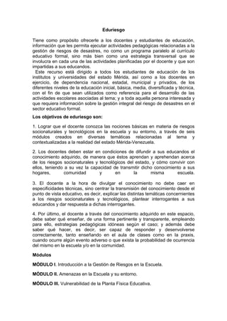 Eduriesgo tiene como objetivo ofrecer información a docentes y estudiantes sobre gestión de riesgos de desastres de forma transversal en las actividades escolares. El recurso está dirigido a instituciones educativas en Mérida, Venezuela. Sus objetivos son que los docentes conozcan nociones básicas sobre riesgos a través de seis módulos temáticos, que difundan este conocimiento a los estudiantes, y que sepan cómo enseñar y responder ante eventos adversos. Los módulos cubren introducción a gestión de riesgos