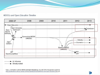Los MOOCs son cursos online masivos y abiertos que fomentan la participación interactiva y ofrecen una variedad de recursos educativos, incluyendo foros y materiales multimedia. Desde su creación en 2008, han evolucionado en dos tipos: c-MOOC y x-MOOC, con enfoques pedagógicos diferentes y el surgimiento de plataformas como Coursera y EdX. La educación está en un proceso de transformación hacia modelos más personalizados y adaptativos, reflejando cambios sociales y económicos en la educación superior.