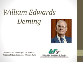 William Edwards Deming fue un estadístico estadounidense conocido por ayudar a Japón a mejorar sus procesos de calidad después de la Segunda Guerra Mundial. Propuso los 14 puntos de Deming para la gestión empresarial, que incluyen mejorar continuamente los sistemas de producción, instituir capacitación en el trabajo, eliminar el temor en el lugar de trabajo, y establecer programas de educación y entrenamiento. También destacó la importancia del control estadístico de procesos para entender y reducir la variabilidad.