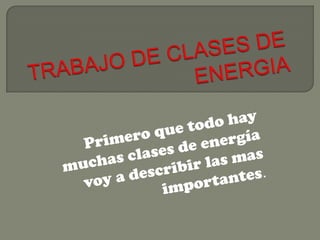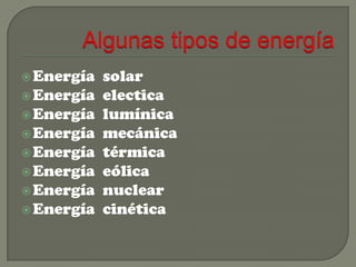 Este documento define y describe brevemente 8 tipos de energía: solar, eléctrica, lumínica, mecánica, térmica, eólica, nuclear y cinética. Explica que la energía solar se obtiene de la radiación del sol, la eléctrica del movimiento de electrones, la lumínica de la luz, la mecánica de la posición y movimiento de objetos, la térmica de la temperatura, la eólica del viento, la nuclear funciona en centrales y la cinética es la energía de movimiento.