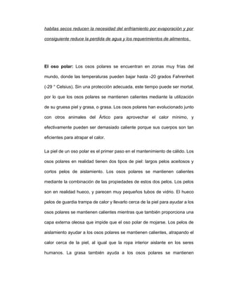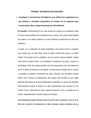Este documento presenta 3 ejemplos de mecanismos fisiológicos que utilizan organismos para contrarrestar altas o bajas temperaturas: 1) El camello almacena grasa y mantiene una temperatura corporal estable. 2) El oso polar tiene una gruesa piel y grasa que lo aislan del frío. 3) Los cactus abren sus estomas de noche para capturar CO2 y lo usan durante el día para fotosintesis, evitando así la pérdida de agua.