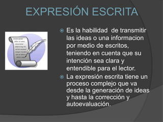 El documento trata sobre la expresión escrita y los diferentes géneros literarios. Explica que la expresión escrita implica transmitir ideas de manera clara y entendible para el lector, y que involucra un proceso complejo desde la generación de ideas hasta la corrección. Luego define los principales géneros literarios como el dramático, lírico y narrativo, y también géneros didácticos como la oratoria y el ensayo, describiendo brevemente las características de cada uno.