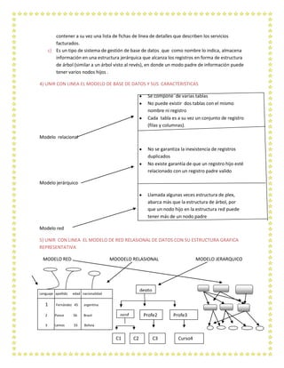 El documento presenta 7 preguntas sobre conceptos básicos de bases de datos relacionales, jerárquicas y de red. Las preguntas abarcan definiciones de los diferentes modelos, sus características y componentes principales como tablas, registros y campos. También incluye gráficos que representan la estructura de cada modelo.