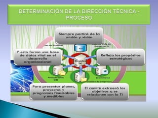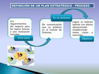 Este documento describe el proceso de planificación estratégica de una empresa, incluyendo la definición de objetivos estratégicos a largo plazo, el establecimiento de metas claras y concretas, y garantizar que los sistemas de TI satisfagan las necesidades cambiantes del negocio.