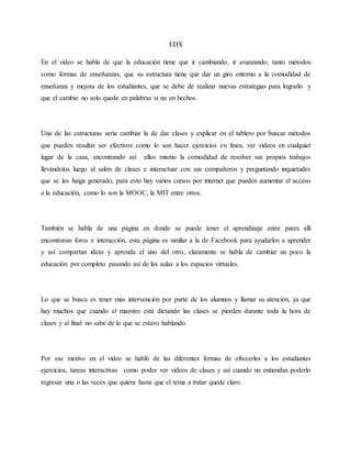 El documento habla sobre la necesidad de modernizar la educación adoptando nuevos métodos de enseñanza como cursos en línea, videos educativos y plataformas de aprendizaje colaborativo. Estos cambios permitirían que los estudiantes aprendan a su propio ritmo y lugar, interactúen con compañeros para resolver dudas, y se involucren más en clase a través de ejercicios y tareas interactivas. El objetivo final es mejorar el aprendizaje de los estudiantes al darles más control y flexibilidad sobre su educación
