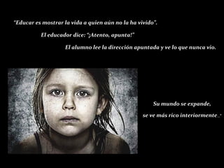 El documento habla sobre la importancia de la educación y la enseñanza. Argumenta que la educación debe enseñar a los estudiantes a ver el mundo de una manera más rica e interiormente, expandiendo su perspectiva. También enfatiza la importancia de educar las sensibilidades de los estudiantes para que puedan apreciar la belleza del mundo.