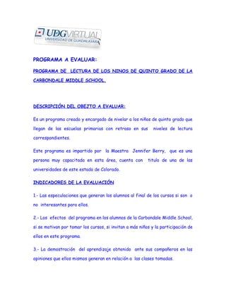 Se realizó una evaluación de impacto de un programa de lectura para niños de quinto grado con retraso en sus habilidades lectoras en una escuela secundaria en Colorado. La evaluación utilizó instrumentos cualitativos como observaciones y entrevistas. Los resultados mostraron que la mayoría de los estudiantes sintieron que mejoraron su comprensión lectora y disminuyeron sus sentimientos de inseguridad al leer. Además, la mayoría de los estudiantes calificaron el programa con un 10 en una escala del 5 al 10.