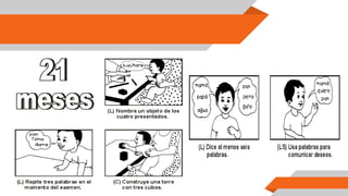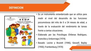La Escala de Evaluación del Desarrollo Psicomotor (EEDP) es un instrumento estandarizado que mide el desarrollo psicomotor de niños entre 0 y 24 meses a través de la evaluación de 75 tareas. Identifica el coeficiente de desarrollo psicomotor y puede detectar alteraciones en habilidades y destrezas. Evalúa áreas como coordinación, lenguaje, socialización y motricidad gruesa. Proporciona una edad mental, razón, puntaje estándar y perfil de desarrollo que permiten interpretar el n