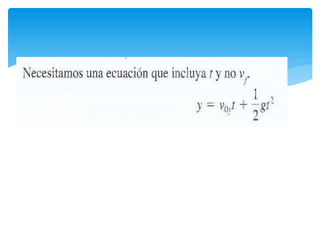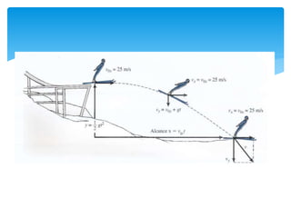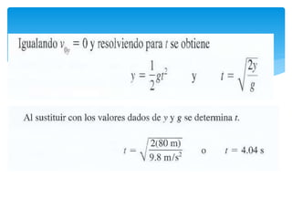 Este documento presenta un ejercicio de física sobre el movimiento parabólico de un esquiador. El esquiador salta de una rampa a una altura inicial de 80 metros y con una velocidad inicial horizontal de 25 m/s. Se pide calcular (a) el tiempo en el aire, (b) la distancia horizontal recorrida, y (c) las componentes horizontal y vertical de la velocidad final. El documento explica los pasos para resolver cada parte del ejercicio usando las ecuaciones apropiadas de movimiento parabólico.