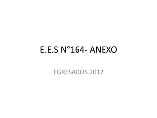 Este documento se dirige a los egresados del año 2012 de la Escuela N°164 para recordarles los años compartidos en la escuela desde 2008 hasta 2012, con viajes e instancias educativas inolvidables como la visita a la casa de Domingo Faustino Sarmiento y la feria de ciencias. Les desea éxito en su futuro y les recuerda que lo más importante es intentar y nunca rendirse.