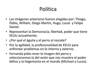 El documento resume algunos aspectos clave de la política y cultura de Estados Unidos. Explica que Estados Unidos tiene un sistema democrático y bipartidista dominado por los partidos Demócrata y Republicano. También destaca que Barack Obama fue el primer presidente negro de Estados Unidos, lo que muestra una disminución del racismo. Además, presenta imágenes que representan el poder militar y la influencia global de Estados Unidos.