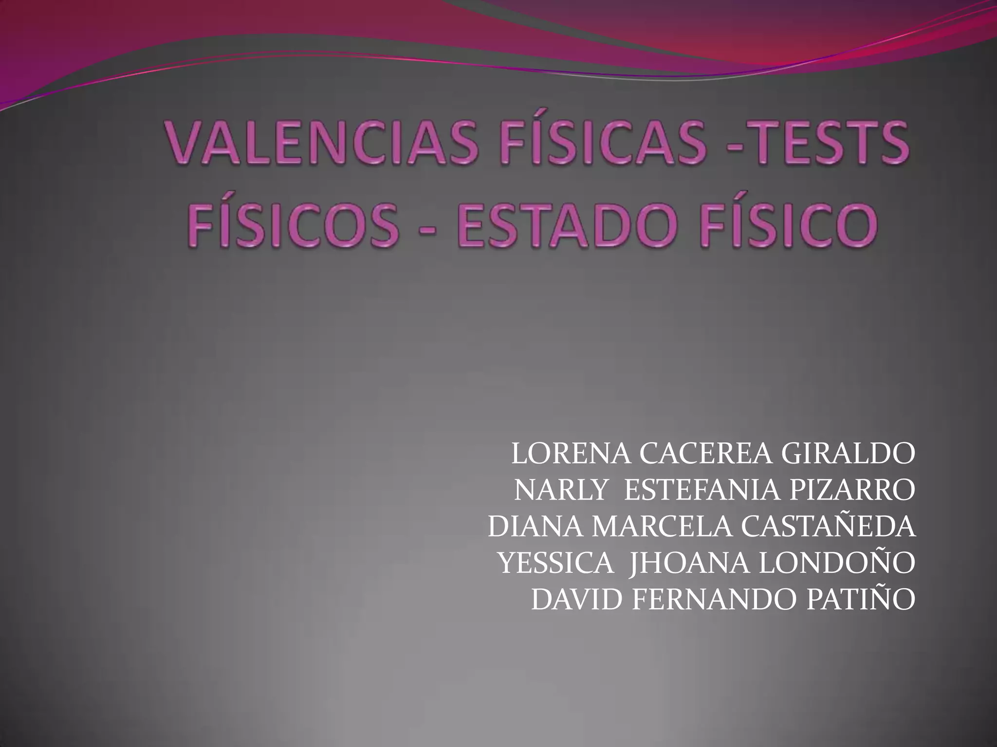 Este documento describe las valencias físicas (aspectos físicos naturales o adquiridos que determinan la condición física), incluyendo la fuerza, resistencia, velocidad, flexibilidad, coordinación, equilibrio y potencia. Explica que las cuatro valencias básicas son la fuerza, resistencia, velocidad y flexibilidad. También describe varios tests físicos para evaluar estas valencias y el estado físico general de un individuo.