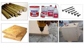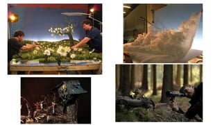 El documento proporciona información sobre los materiales y técnicas para fabricar el escenario de un cortometraje, incluyendo maderas, metales, plásticos, herramientas y lugares para comprar suministros. También recomienda revisar los encuadres de cámara y hacer croquis para planear las dimensiones del escenario. Además, proporciona enlaces a sitios web con tutoriales sobre la construcción de escenarios y efectos especiales para stop motion.