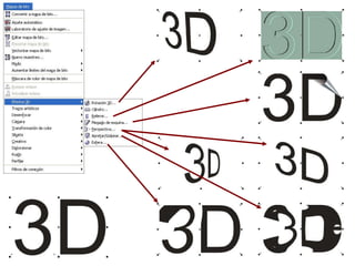 El documento proporciona instrucciones para crear efectos 3D en imágenes. Recomienda convertir la imagen a mapa de bits y usar alta resolución. Explica cómo girar, dar sombreado y plegar las imágenes, y cómo utilizar herramientas como abultamiento, perspectiva y nodos para crear la ilusión de profundidad y objetos 3D. También cubre cómo dar forma y color a las imágenes para lograr diferentes efectos 3D.