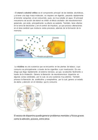 Las drogas afectan principalmente los receptores de membrana de las neuronas y alteran los procesos sinápticos como la liberación y recaptación de neurotransmisores. El consumo prolongado puede generar adicción, tolerancia y dependencia. Diferentes drogas como la cocaína, las anfetaminas y la marihuana actúan bloqueando la recaptación o potenciando la liberación de dopamina, lo que afecta funciones cerebrales y conductuales.