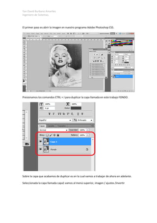 El documento describe los pasos para crear un efecto de imagen dibujada a lápiz en Adobe Photoshop CS5. Primero, se duplica la capa de fondo de la imagen y se invierte. Luego, se cambia el modo de fusión a sobreexponer color y se desenfoca la imagen. Finalmente, se aplican las herramientas de niveles y texturizar para perfeccionar el efecto de lápiz.