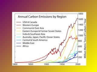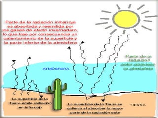 El documento explica el efecto invernadero y el cambio climático. Define el efecto invernadero como la absorción de radiación infrarroja por gases en la atmósfera que aumenta la temperatura de la Tierra. Los principales gases que causan el efecto invernadero son el CO2, metano y óxido nitroso. Aunque estos gases son naturales, las emisiones humanas han aumentado sus niveles y causado el cambio climático global, con consecuencias como el derretimiento de los casquetes polares y el aumento del nivel del mar