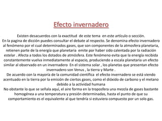 El documento describe el efecto invernadero como el fenómeno por el cual gases en la atmósfera, como el dióxido de carbono y el metano, retienen parte del calor emitido por la Tierra después de ser calentada por el Sol, evitando que esa energía se escape rápidamente al espacio y creando un efecto de calentamiento global. Explica que este efecto ocurre en Venus, la Tierra y Marte y que la mayoría de científicos concuerdan en que las emisiones humanas han intensificado el efecto invernadero terrest