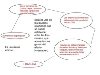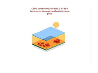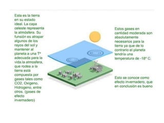 El documento describe el efecto invernadero y sus consecuencias. Explica que los gases de efecto invernadero retienen el calor de la Tierra, causando el calentamiento global que lleva a cambios climáticos como aumento de temperaturas, sequías e inundaciones. También habla sobre la capa de ozono y el agujero de la capa de ozono causado por los clorofluorocarbonos, lo que aumenta la radiación ultravioleta. Finalmente, señala que el aumento de los gases de efecto invernadero se debe a la activ