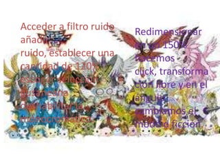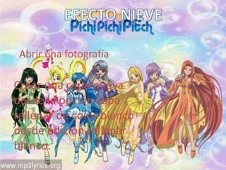 Este documento proporciona instrucciones para editar una fotografía para agregar efectos de nieve utilizando varios filtros y capas en un editor de imágenes. Las instrucciones incluyen crear una capa blanca, agregar ruido, redimensionar la imagen, aplicar un filtro de umbral, desenfocar y repetir los pasos con diferentes configuraciones para lograr el efecto deseado.