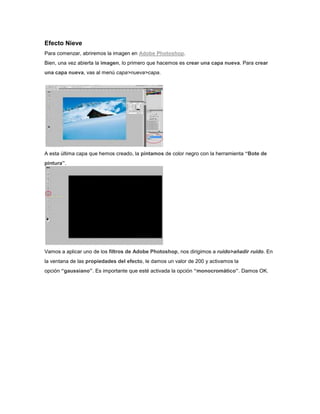 Este documento proporciona instrucciones paso a paso para crear un efecto de nieve en una imagen utilizando Adobe Photoshop. Primero, se crea una nueva capa negra y se aplican filtros como ruido y desenfoque para simular copos de nieve. Luego, se ajustan los niveles y el modo de fusión para ver la nieve sobre la imagen subyacente. Más filtros como desenfoque de movimiento, cristalizar y duplicación/rotación de capas agregan realismo a la nieve simulada.