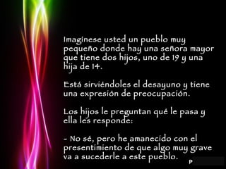 La historia narra cómo un pequeño pueblo entra en pánico colectivo después de que una mujer tenga un presentimiento de que algo malo sucederá. A medida que se difunde el rumor, la gente comienza a prepararse comprando comida y abandonando el pueblo, creando un éxodo masivo a pesar de que no ha ocurrido ningún desastre real. Esto ilustra el fenómeno psicológico conocido como "profecía autocumplida", donde las expectativas negativas pueden hacer que se materialicen los resultados neg