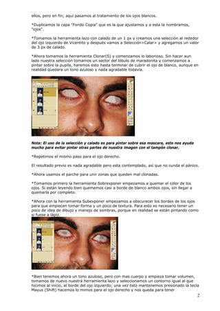 Este documento proporciona instrucciones paso a paso para crear un retrato de estilo zombi utilizando Photoshop. Inicialmente, se duplica la capa de fondo para proteger la imagen original y se ajustan los colores. Luego, se clonan áreas blancas sobre los ojos para hacerlos parecer muertos vivientes y se usan las herramientas de exposición para darles forma y textura. Finalmente, se agregan texturas sobre las capas para lograr un aspecto terrorífico y se realizan ajustes finales como sombras de