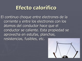 La corriente eléctrica produce varios efectos útiles como calor, química, luz, magnetismo y movimiento. Produce calor al chocar los electrones con los átomos del conductor y se usa esto en estufas. Químicamente puede transformar sustancias mediante electrolisis para proteger metales, mejorar aspectos o extraer metales de minerales. Magnéticamente crea imanes a su alrededor y mueve brújulas. Mecánicamente también se comporta como un imán y así se produce movimiento en motores eléctric